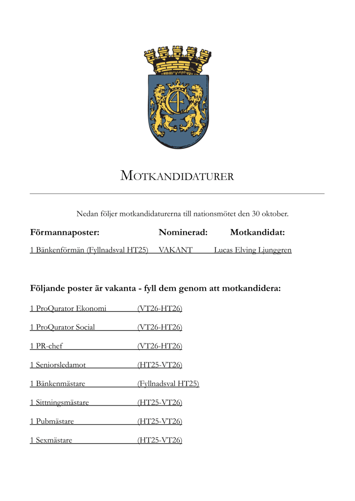 Till höstens andra nationsmöte den 30 oktober har följande motkandidaturer inkommit. Till vakanta förmanna- och mästarposter är det möjligt att motkandidera på mötet.