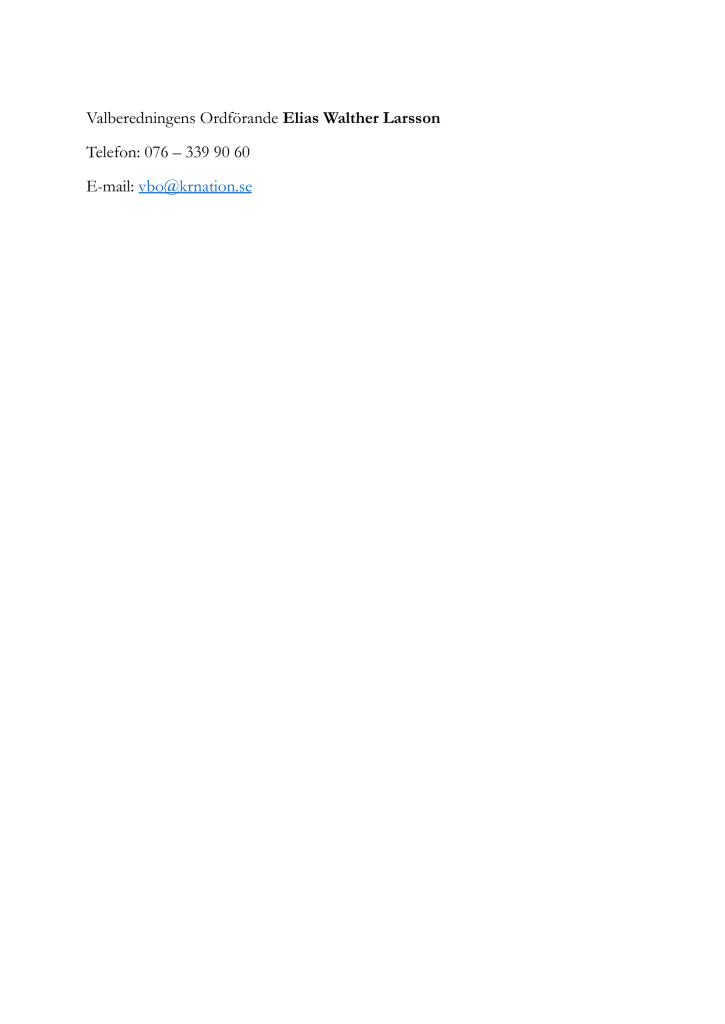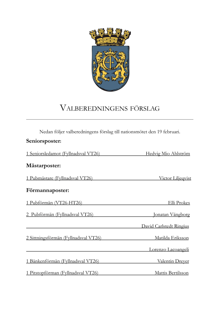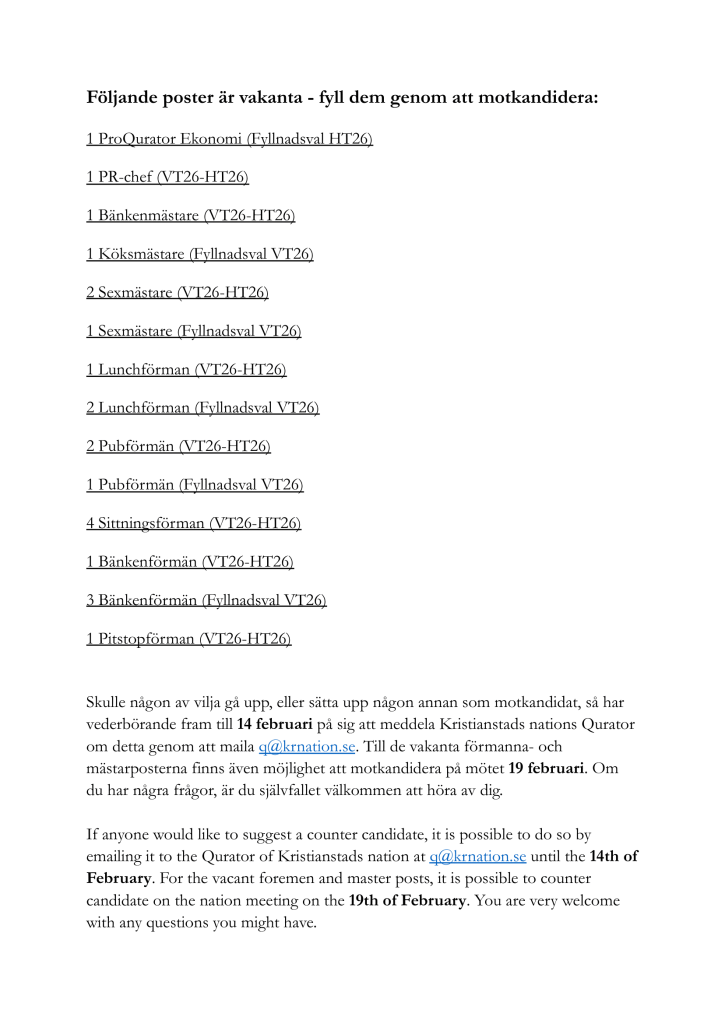 Härmed tillkännages valberedningens förslag på förtroendevalda som ska tillsättas på vårens första nationsmöte. För den som önskar att motkandidera görs detta genom att maila q@krnation.se där du informerar vilken post du önskar motkandidera mot. Du kan motkandidera fram tills den 14 februari.