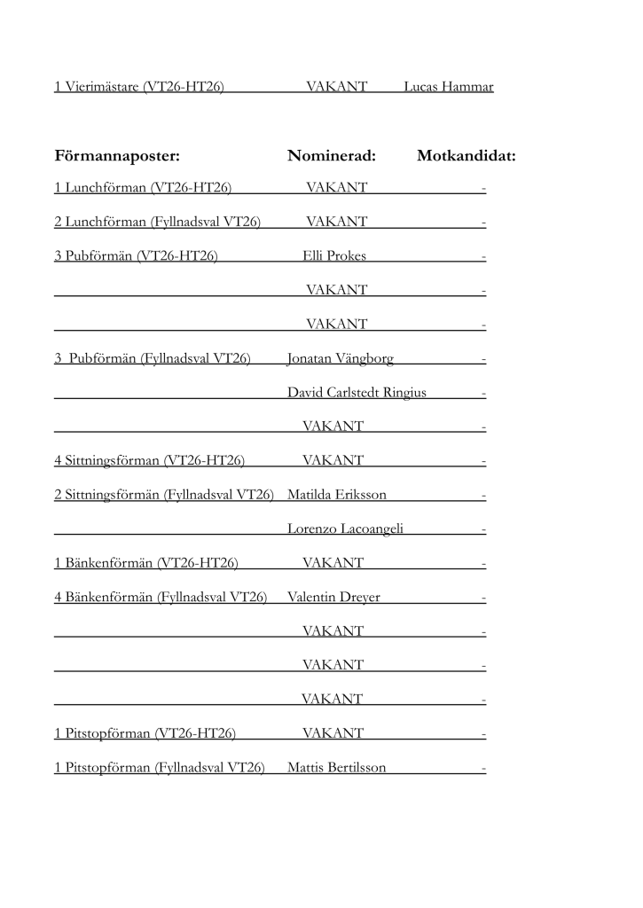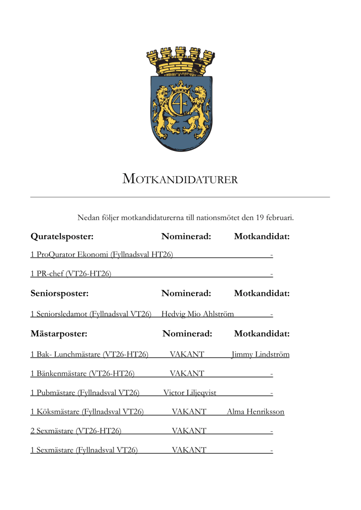 Till vårens första nationsmöte den 19 februari har följande motkandidaturer inkommit. Till vakanta förmanna- och mästarposter är det möjligt att motkandidera på mötet.