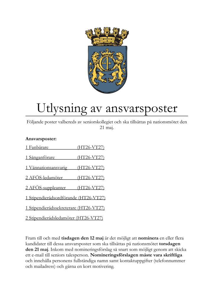 Härmed utlyses ansvarsposterna valberedda av seniorskollegiet som ska väljas på vårens tredje nationsmöte som äger rum den 21 maj. Du har nu möjlighet att nominera dig själv eller någon annan fram till och med den 12 maj.