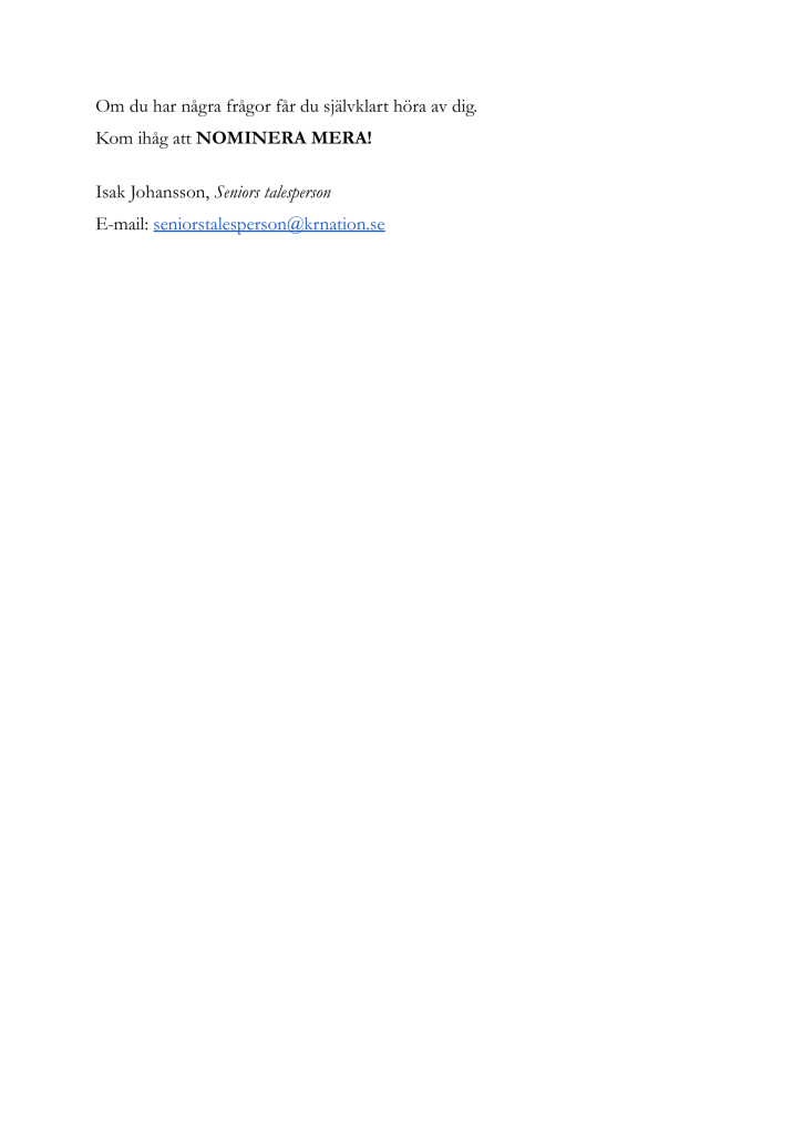 Nominering görs genom att skicka ett mail till seniorstalesperson@krnation.se. Nominera mera!