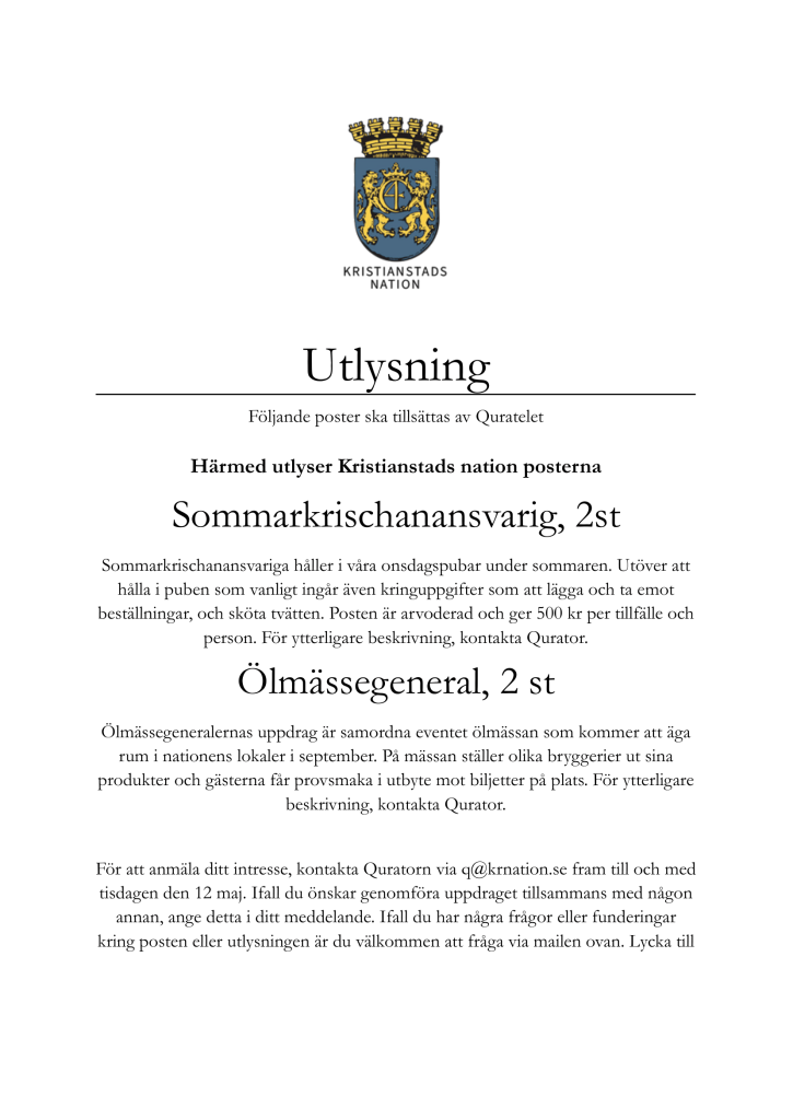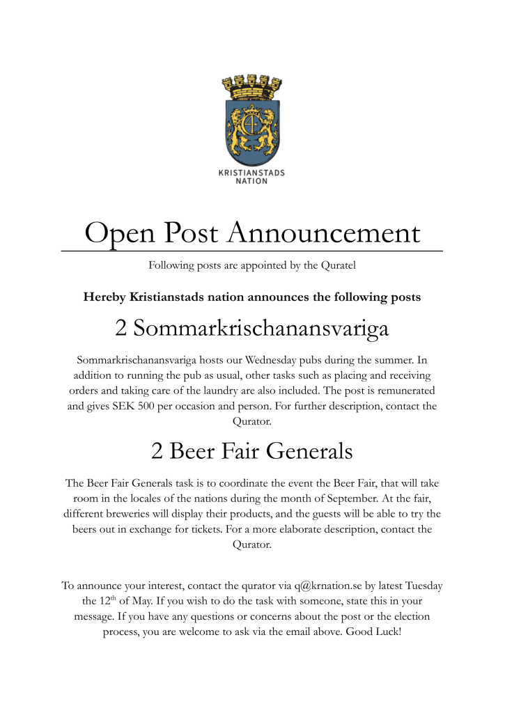 To announce your interest, contact the qurator via q@krnation.se by latest Tuesday the 12th of May. If you wish to do the task with someone, state this in your message. If you have any questions or concerns about the post or the election process, you are welcome to ask via the email above. Good Luck!